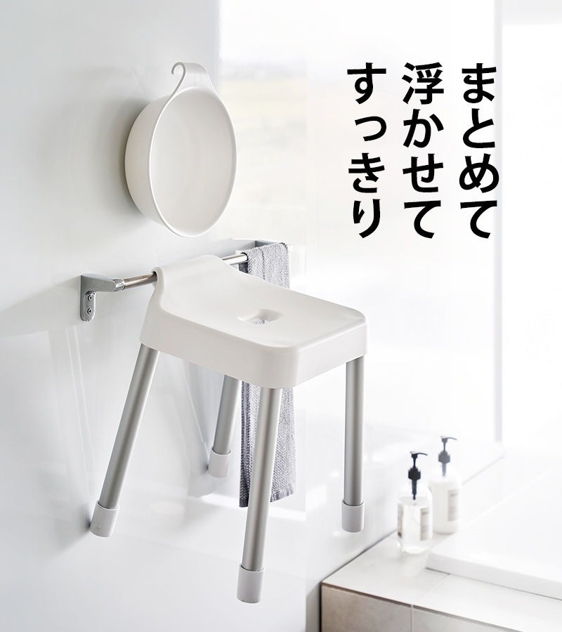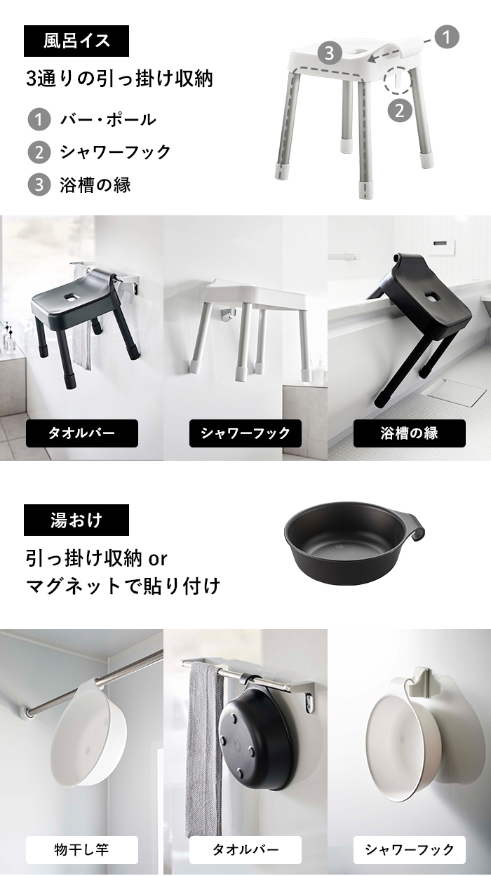 引っ掛けて収納できるバスチェア&湯おけ。浴室乾燥の物干し竿や使っていないシャワーフックなど、浴室内の空いているスペースを活用して収納することができます。