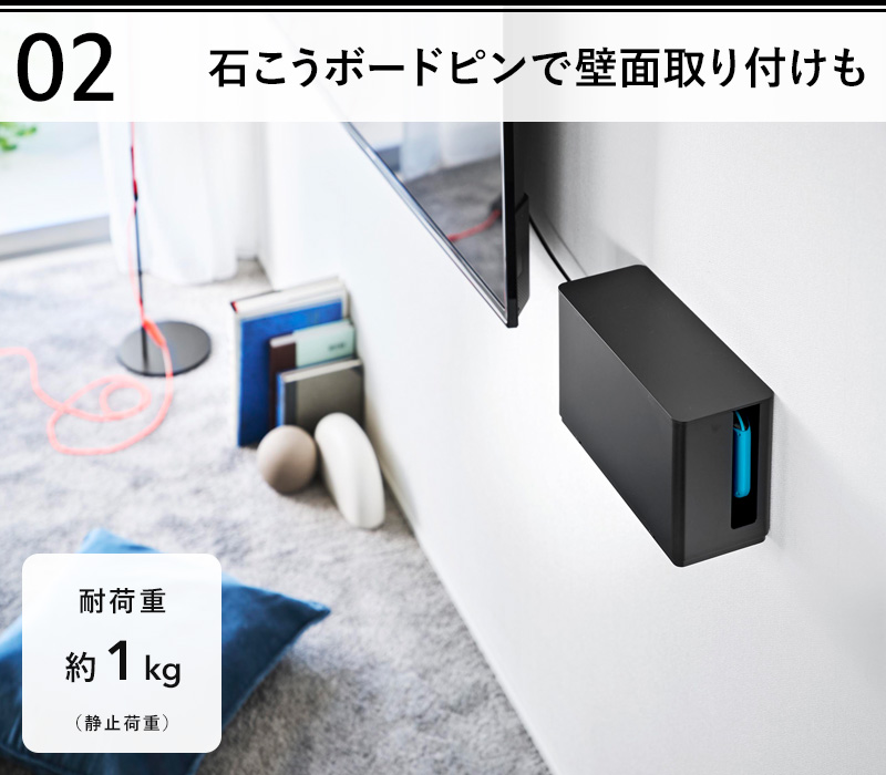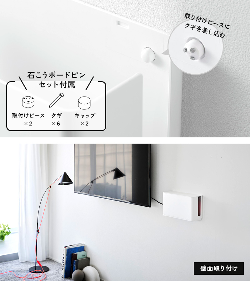 壁面にケースを設置できる石こうボードピンが付属しています。簡単に壁面取り付けでき、取り外した跡も目立ちにくいので賃貸住宅でも安心してお使いいただけます。テレビやモニター、電源の位置によって最適な場所で使うことができます。