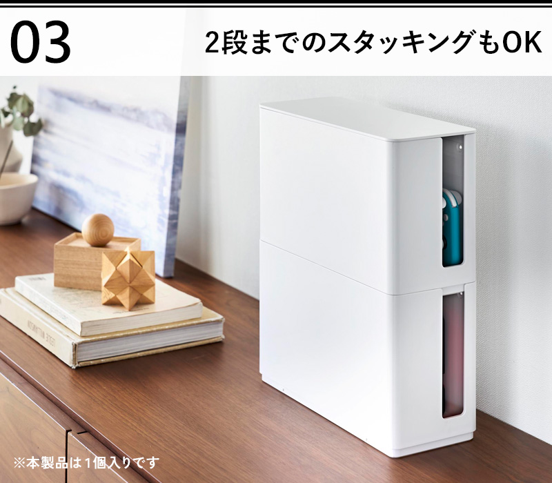 こちらの収納ケースは2個までスタッキング可能。複数の小型ゲーム機本体を収納したり、周辺機器をまとめるのにぴったりです。シンプルなデザインなので見た目にも収まりがよく、すっきりとした印象の空間がつくれます。
