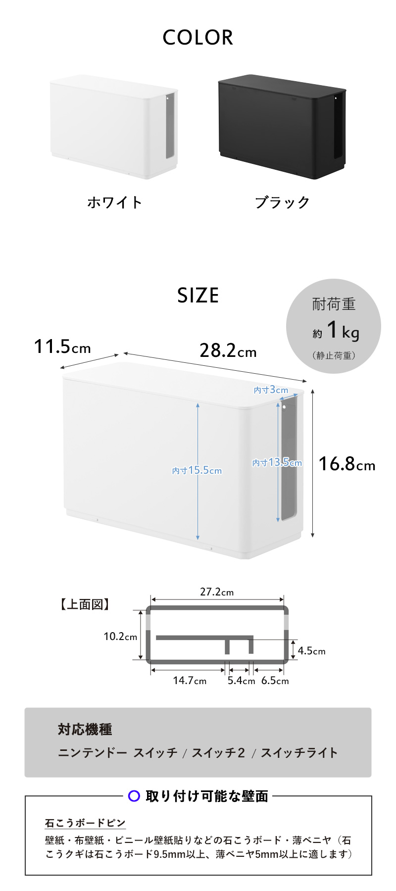 | 備 考 | <取り付け可能な壁> 石こうボードピン使用時:壁紙・布壁紙・ビニール壁紙貼りなどの石こうボード・薄ベニヤ(石こうクギは石こうボード9.5mm以上、薄ベニヤ5mm以上に適します) |