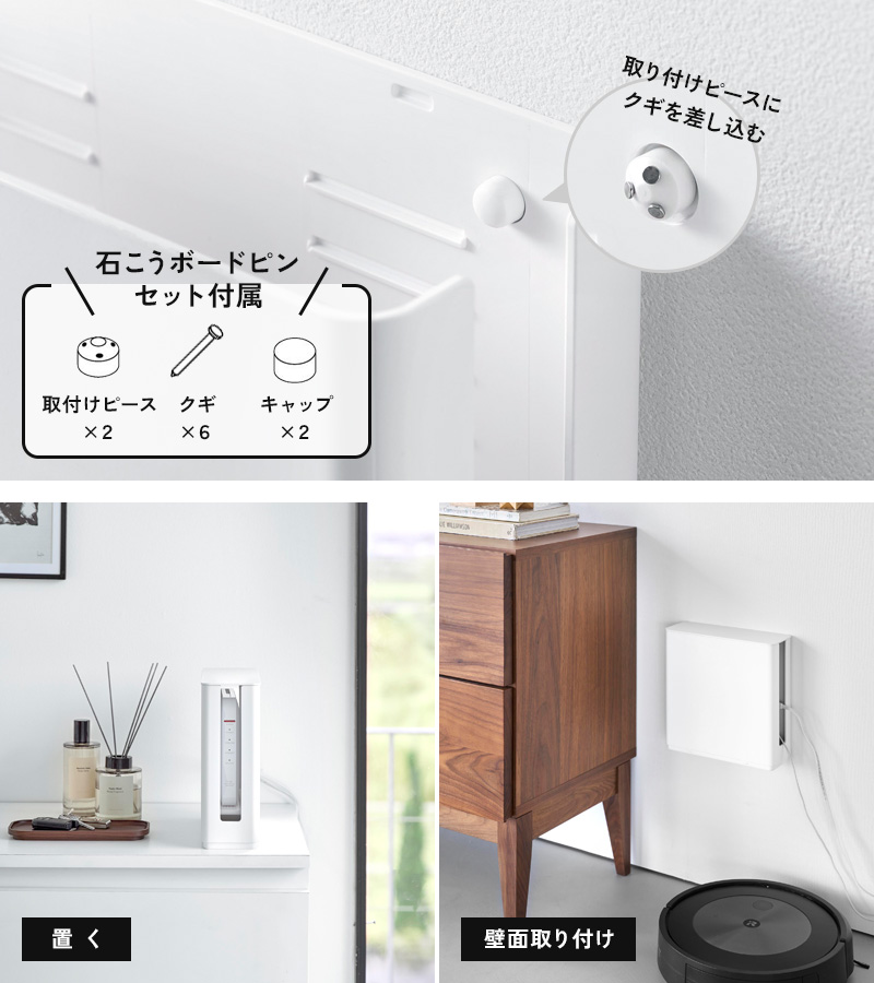 壁面にケースを設置できる石こうボードピンが付属しています。簡単に壁面取り付けでき、取り外した跡も目立ちにくいので賃貸住宅でも安心。LANコンセントや電源の位置によって最適な場所に取り付けてお使いいただけます。