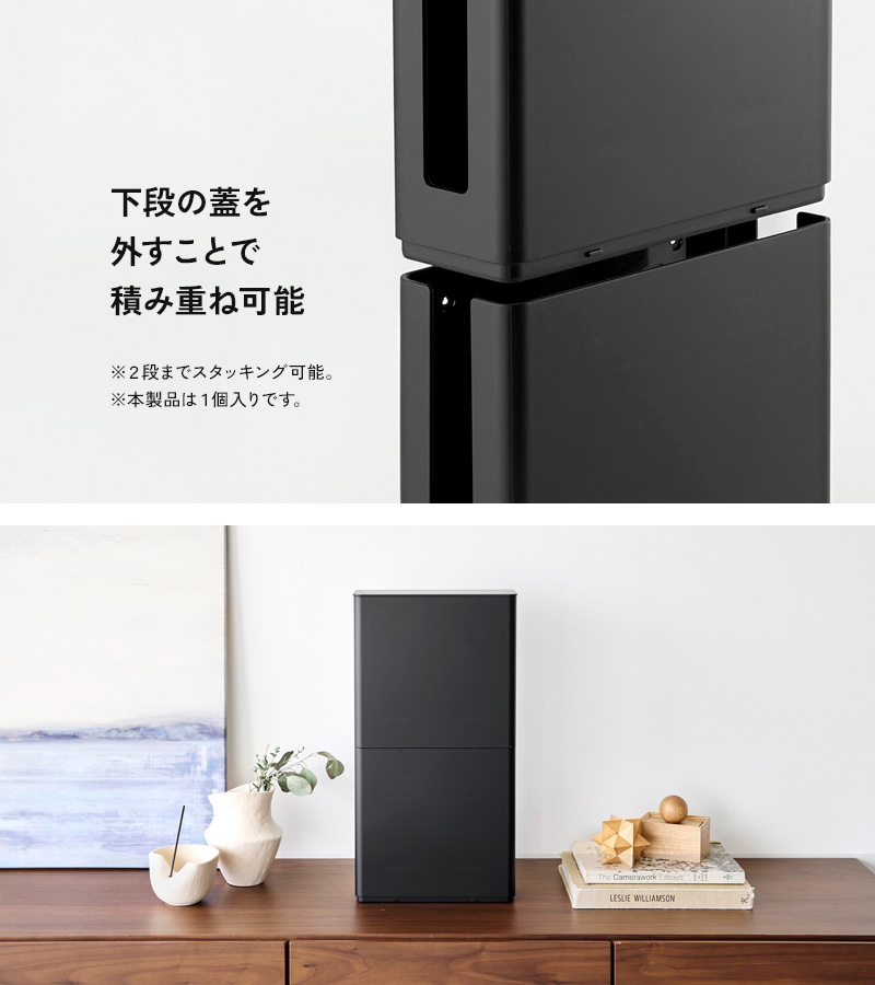 こちらの収納ケースは2個までスタッキング可能。ルーターやONU(光回線終端装置)、モデムなどの機器を一箇所にまとめておくのにぴったりです。シンプルなデザインなので見た目にも収まりがよく、すっきりとした印象の空間がつくれます。