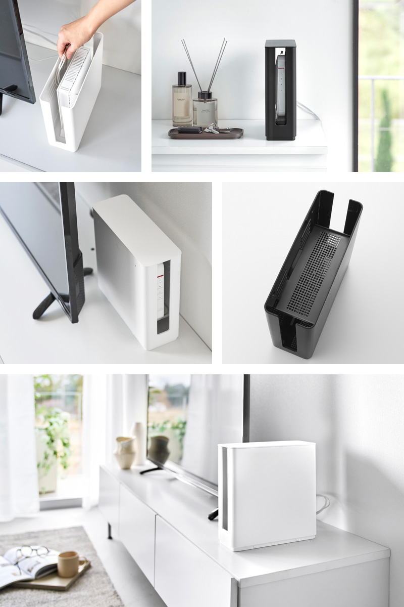 ルーターやケーブルをまとめて収納して、ルーター周りのごちゃつきを解消できるケースです。Wi-Fi6(大型サイズを含む)に対応しており、蓋付きなのでホコリやゴミが内部に入りにくく掃除も簡単。テレビやモニターの後ろに隠せるスリムなサイズなのもポイントです。