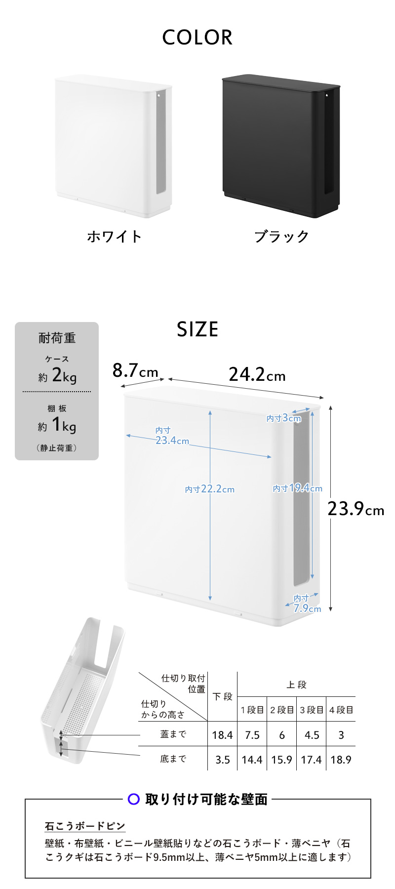 | 耐荷重 | ケース:約 2kg 棚板:約 1kg(静止荷重) |