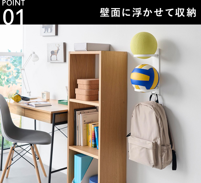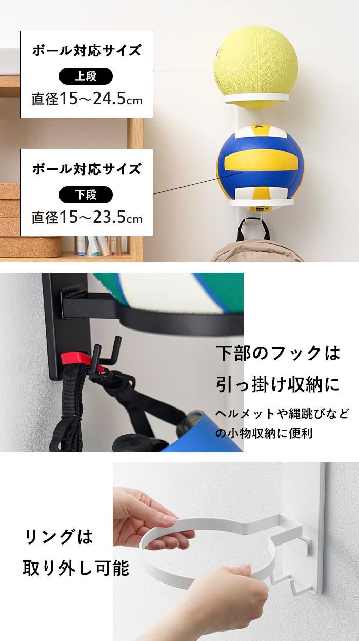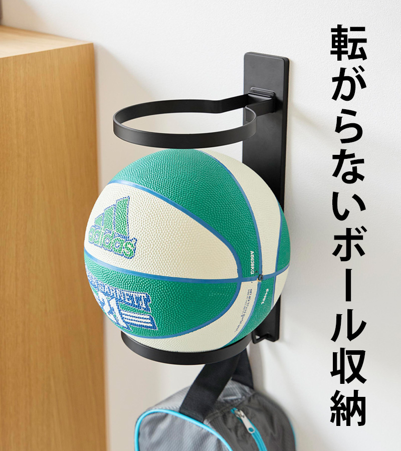 さまざまなサイズのボールに対応しており、縦に並べて最大2個まで収納可能。置き場所に困るボールの定位置づくりに最適です。