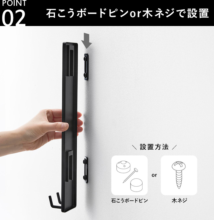取り付けは、付属の石こうボードピンまたは木ネジ壁面に固定するだけ。設置場所に合わせて、取り付け方法を選べます。
