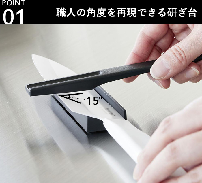 包丁を研ぎ台に置き、シャープナーを水平にスライドさせるだけで、誰でも自然と理想の角度をキープできます。