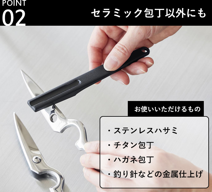 このシャープナーは硬度の高いダイヤモンド砥石を採用しているので、セラミックの他にもステンレス製のハサミ・チタンやハガネの包丁、釣り針などの金属の仕上げなど、便利にお使いいただけます。
