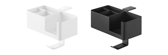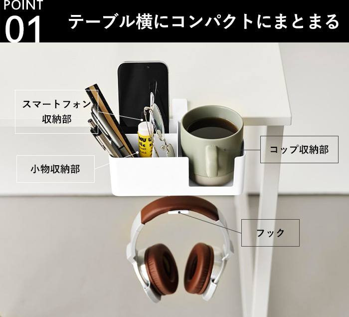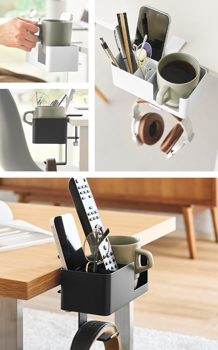 コップ置き、スマホ収納、筆記用具の整頓、ヘッドホンの引っ掛け収納まで、あらゆる小物を収納できるマルチラック。