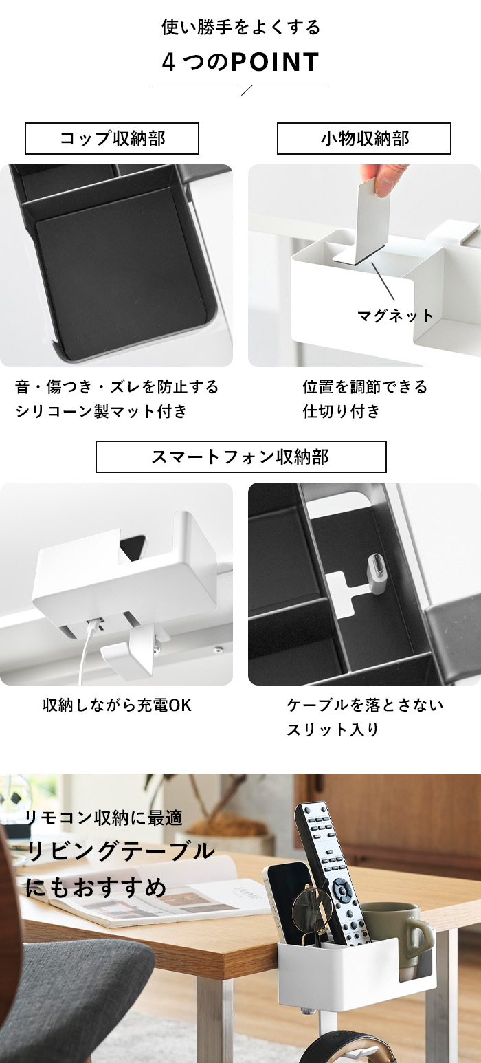 コップやスマホをそれぞれ専用スペースに収納でき、仕切り付きの収納スペースには筆記用具・リモコンなどがすっきりと収まります。