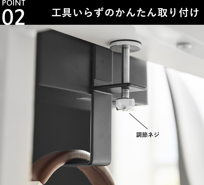 | 備 考 | <取り付け可能な場所> 天板の厚さが、1.2〜5.5cm(幕板やパイプなどを含む)、幅3cm以上(脚含まず)、奥行き4.5cm以上の平らなデスクなど ※設置場所の構造や材質、形状によっては取り付けできない場合があります。 |