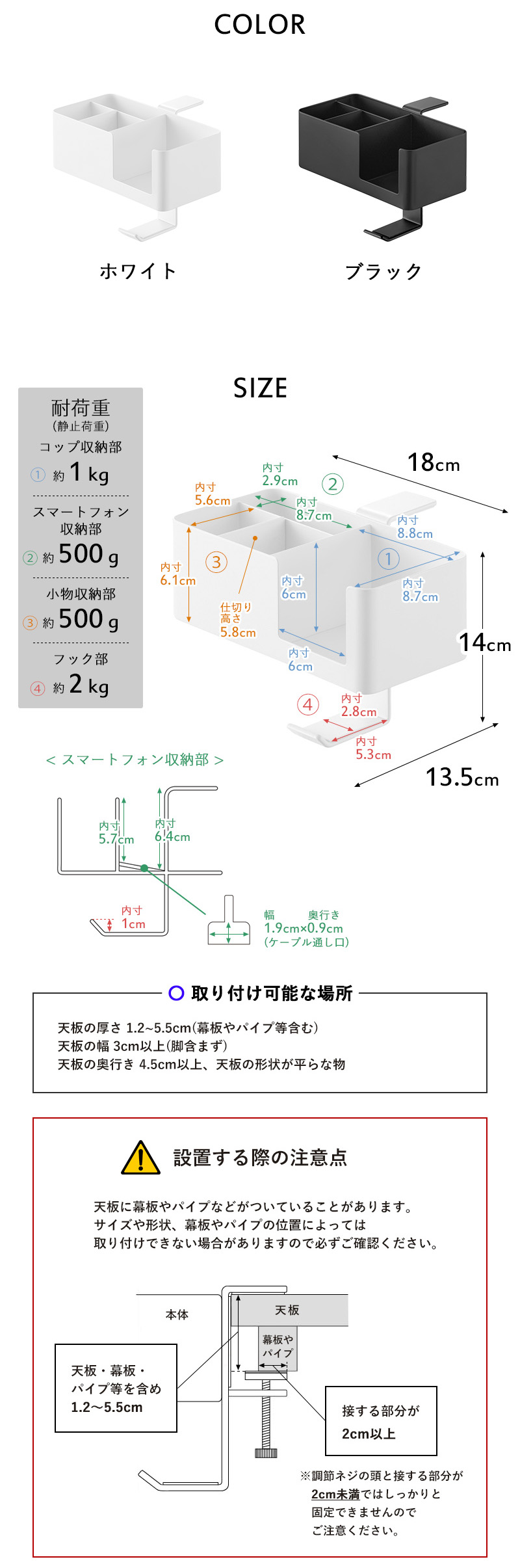 | 耐荷重 | コップ収納部:約 1kg スマートフォン収納部:約 500g 小物収納部:約 500g フック部:約 2kg (静止荷重) |