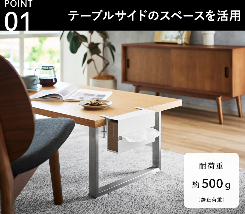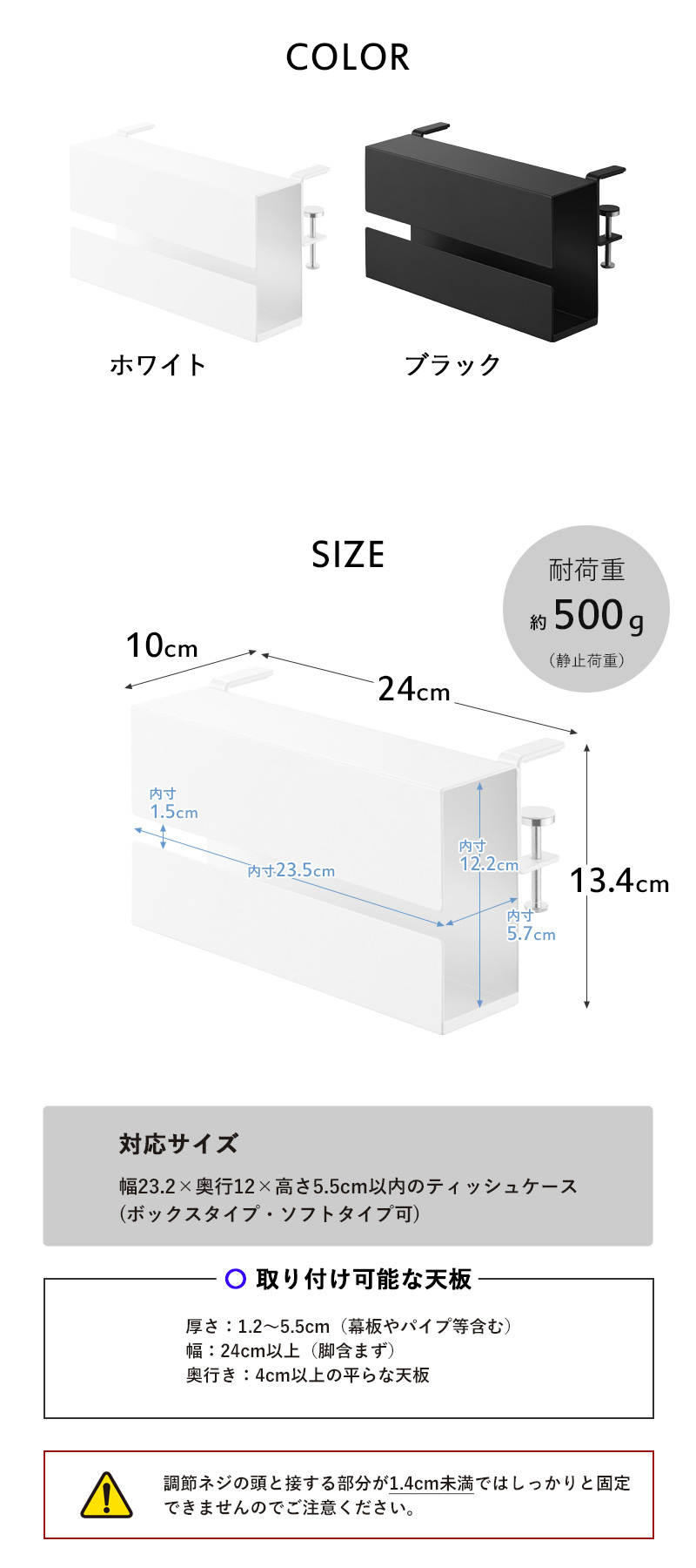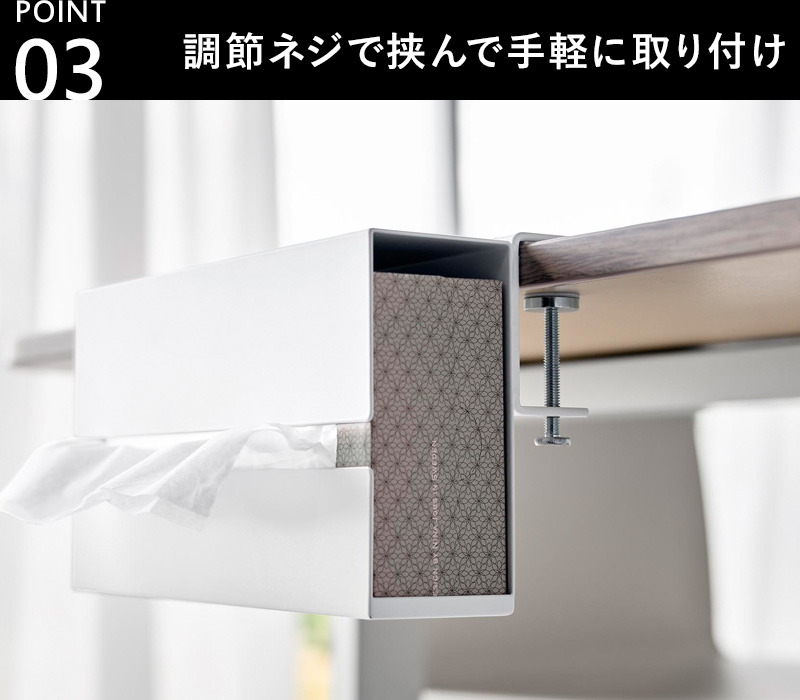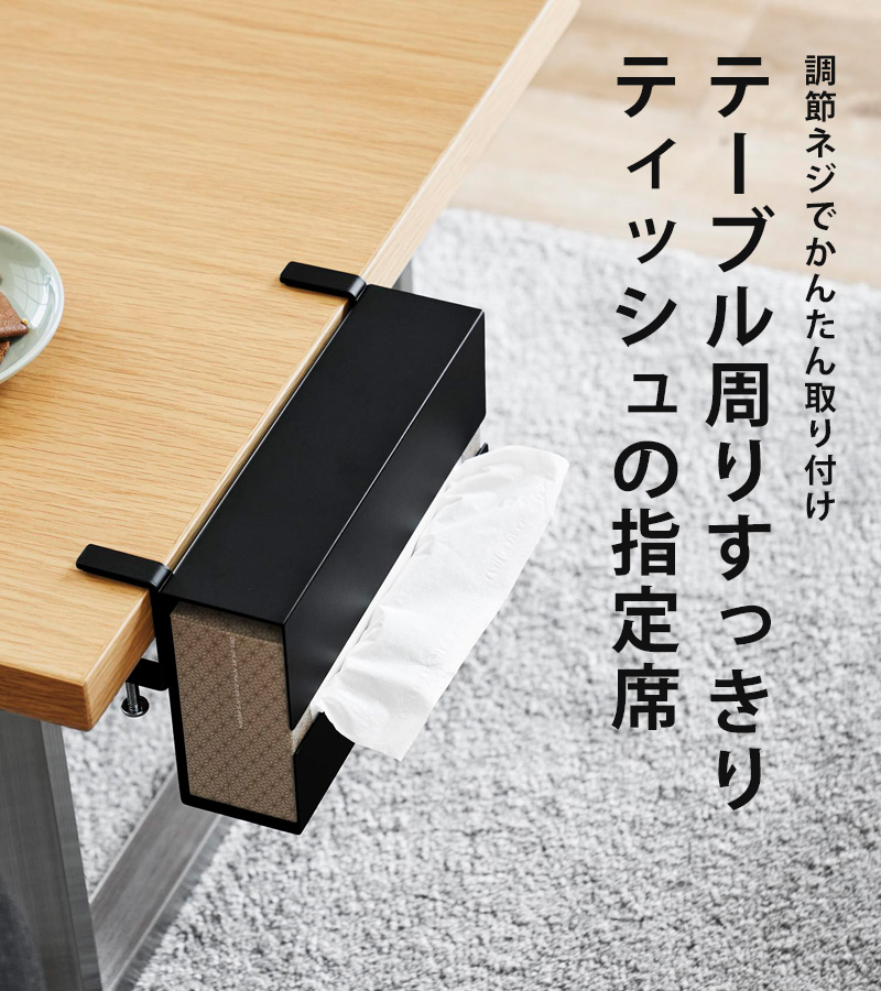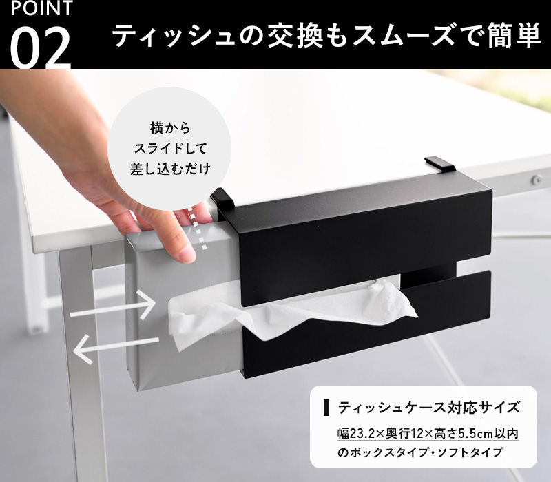 | 備 考 | <対応サイズ> 幅23.2×奥行12×高さ5.5cm以内のティッシュケース(ボックスタイプ・ソフトタイプ可) <取り付け可能な天板> 厚さ:1.2〜5.5cm(幕板やパイプ等含む) 幅:24cm以上(脚含まず) 奥行き:4cm以上の平らな天板 |