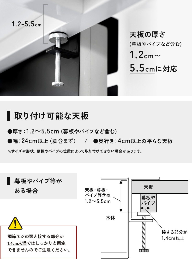 ※天板のサイズや形状、幕板やパイプの位置によっては取り付けできない場合があります。