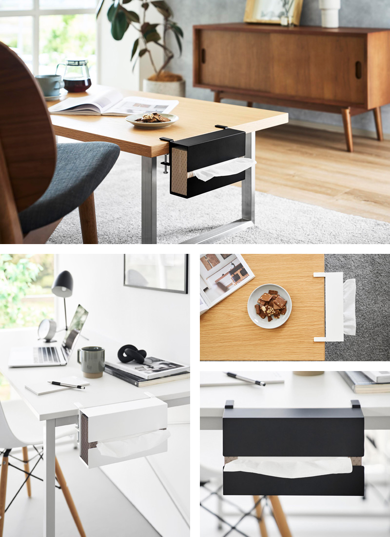 テーブルやデスク横に調節ネジで浮かせて取り付けできる省スペースなティッシュケース。