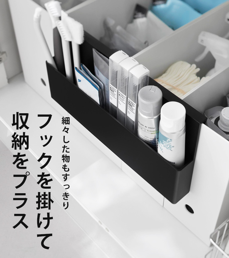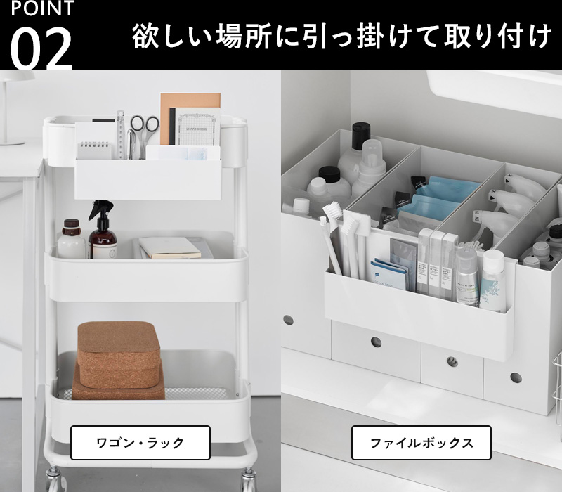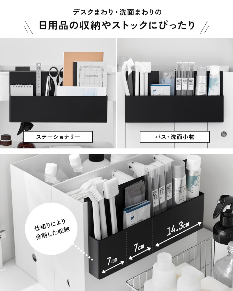 細かな生活雑貨の収納や日用品・消耗品をストックする場所として便利に使えます。収納部の内側は仕切られているので、長めのアイテムを収納しても倒れにくくすっきり。洗面まわりやデスク周辺、キッチンなど物が多くなりがちな所を快適に整理できます。