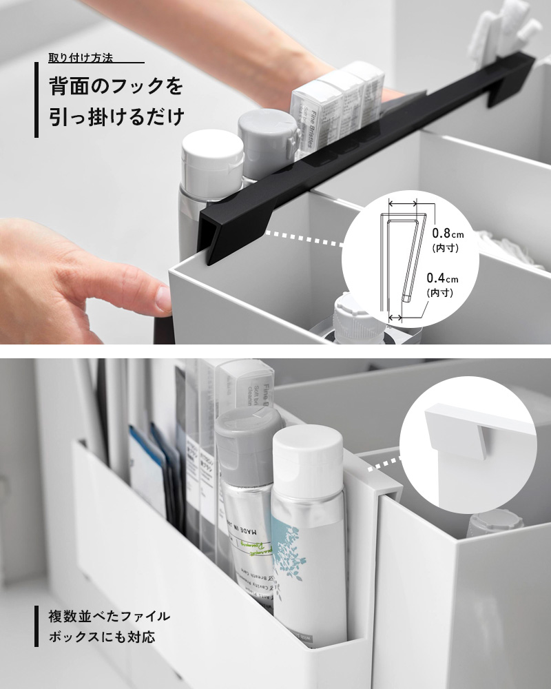 本体背面のフックをファイルボックスやワゴン、ラックのフチに引っ掛けて取り付けます。複数個並べたファイルボックスにも対応した形状で、正面・側面どちらに取り付けても使用可能です。