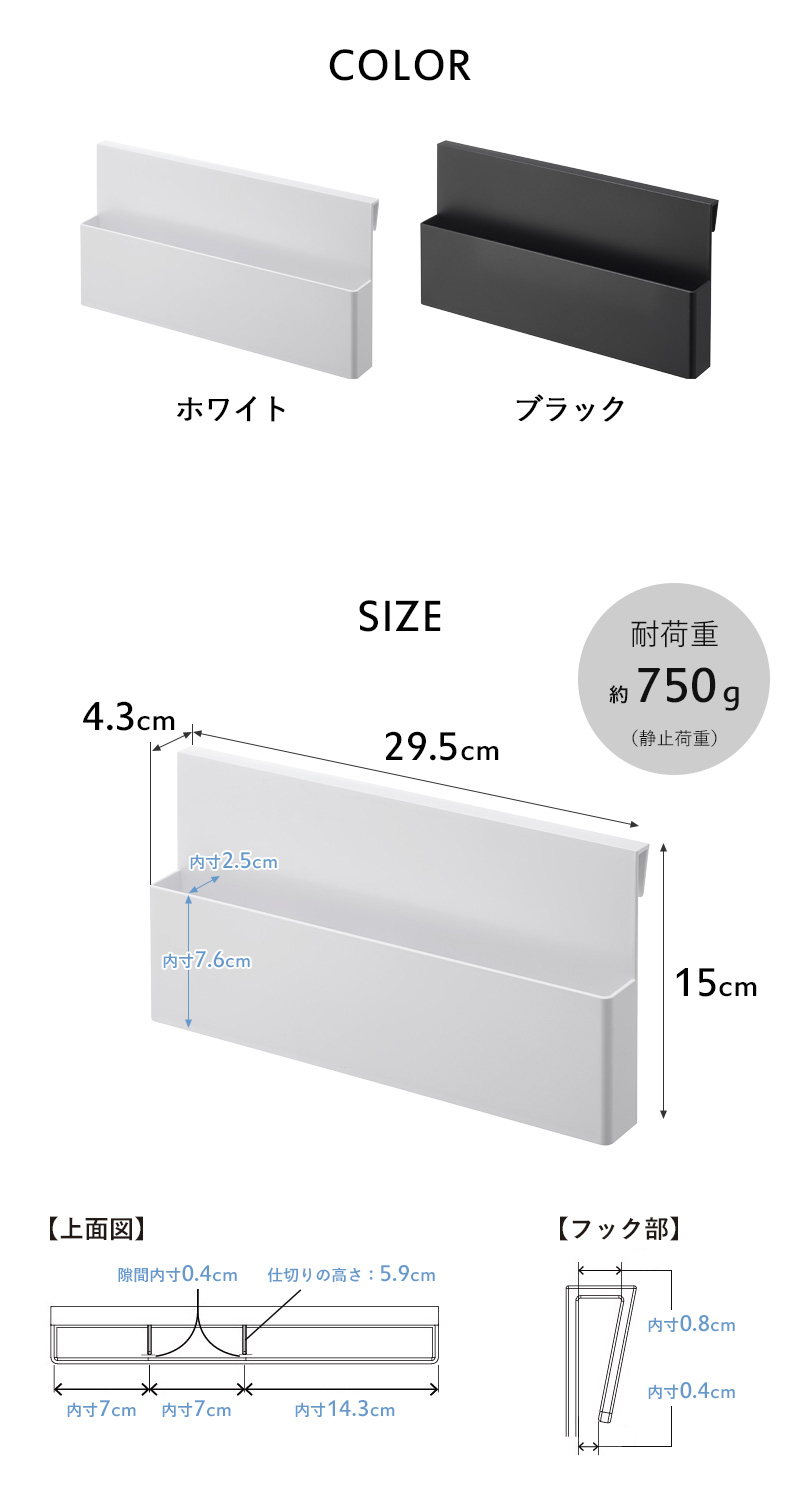 スリムな奥行きと程よい深さで小物を整理しつつすっきり収納。ホルダー内部は仕切りによって7cm/7cm/14.3cmのスペースに分けられており、収納物をサイズ別やグループ別で入れられます。ステーショナリーをまとめたり、歯ブラシや歯磨き粉、美容グッズ等のストックスペースとしても使いやすい快適仕様です。また、小さなお掃除ブラシ等の清掃用品もサッと取り出しやすくなっています。