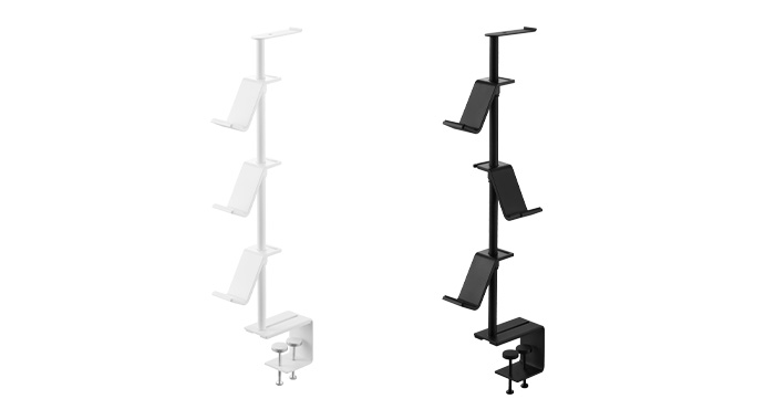 設置はとっても簡単です。天板に差し込んで調節ネジを締めるだけ。2つのネジでしっかりと固定して設置できるので、安定感があり安心してお使いいただけます。さっと手の届くデスク横や、デスク奥に設置して壁際にぴたっと沿わせて設置したり、「ここにあると便利」と思う場所を見つけてお使いください。