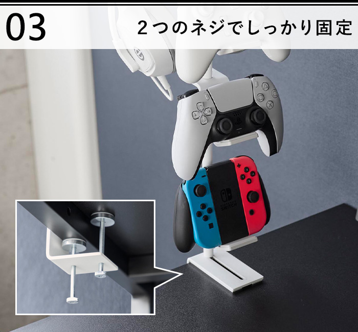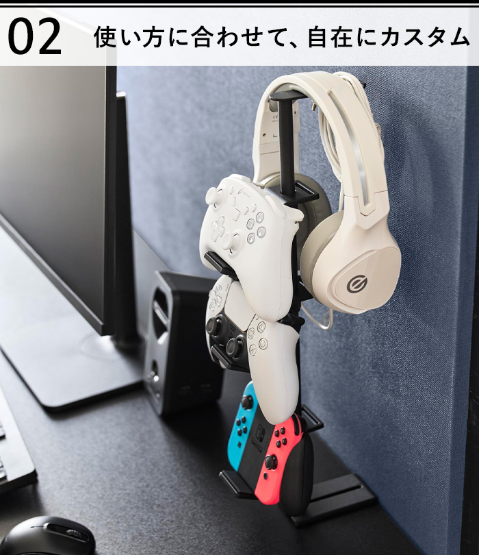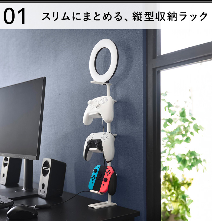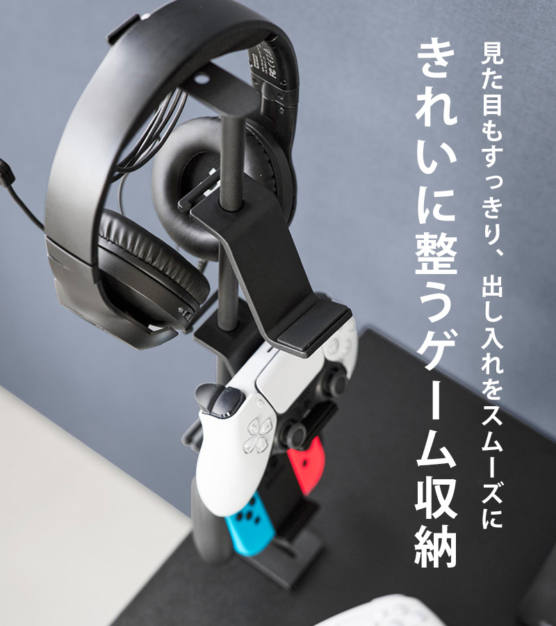 ゲーム用コントローラーやヘッドセットを、縦にスリムに収納できる専用ラック。
