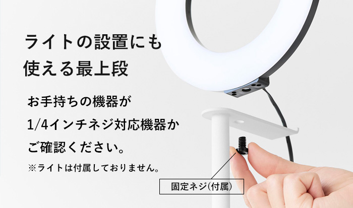 最上部は1/4インチネジ対応機器の設置が可能です。固定用のネジは付属しておりますので、ご使用予定の機器が1/4インチネジ対応かどうか、あらかじめご確認ください。