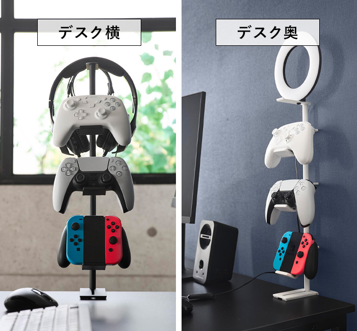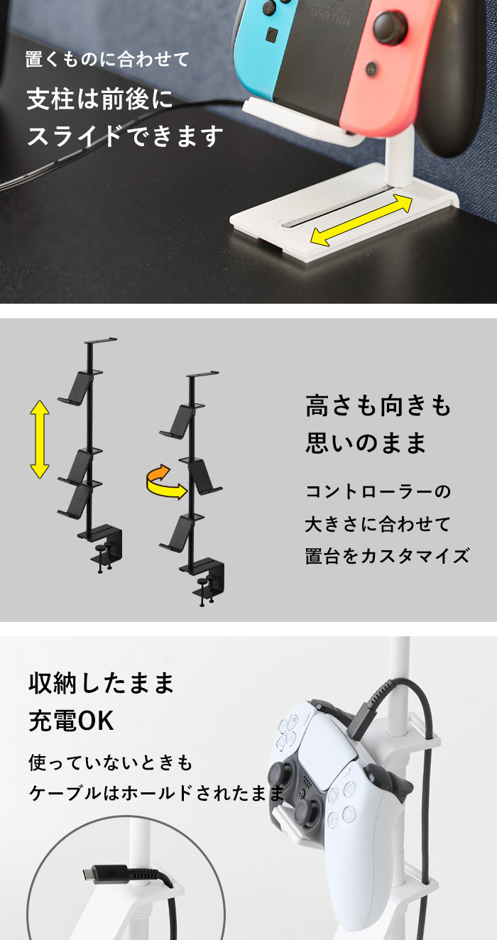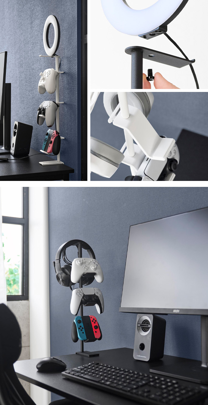 最大3個のコントローラーを収納でき、置台の高さや向きは自由に調節可能。最上段はヘッドセットを掛けたり、リングライトの設置にも対応しています。