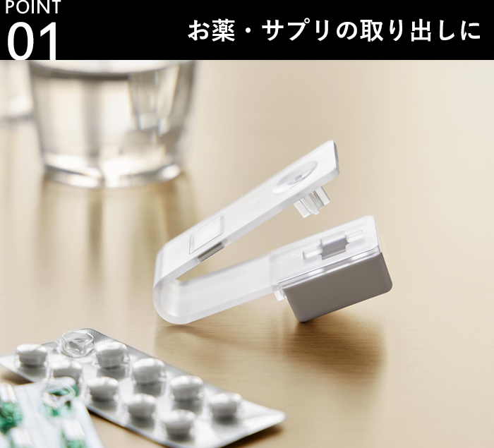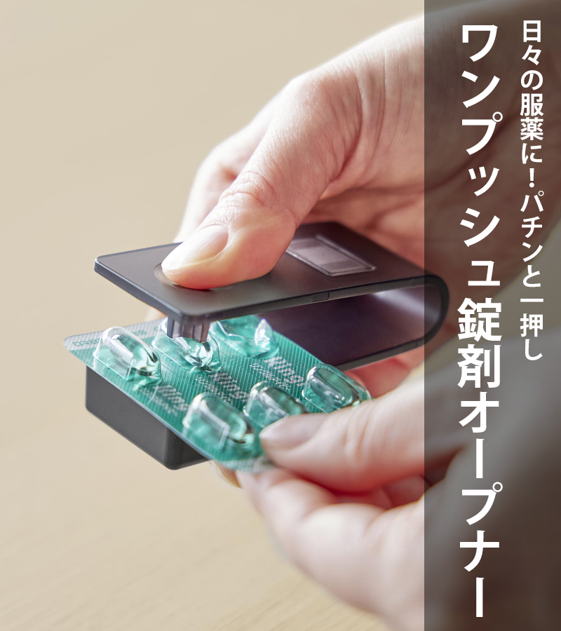 日々の服薬に便利な錠剤オープナー。シートをはさんで握るだけで1錠を楽に取り出すことが可能です。