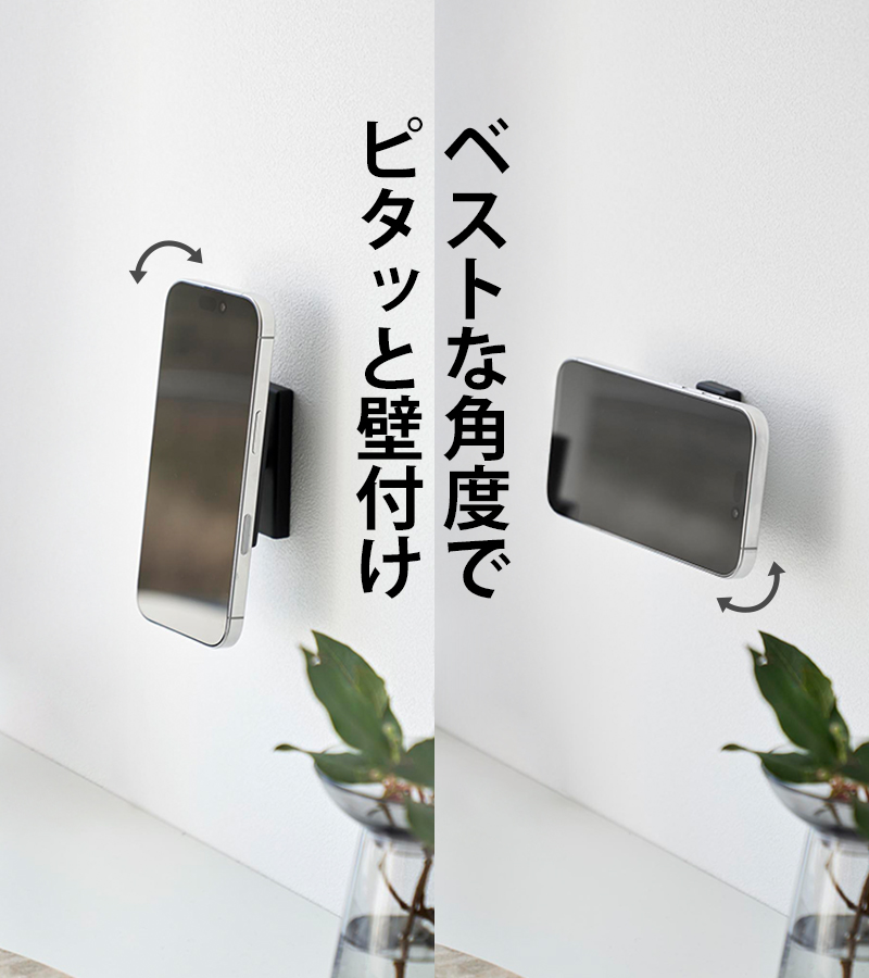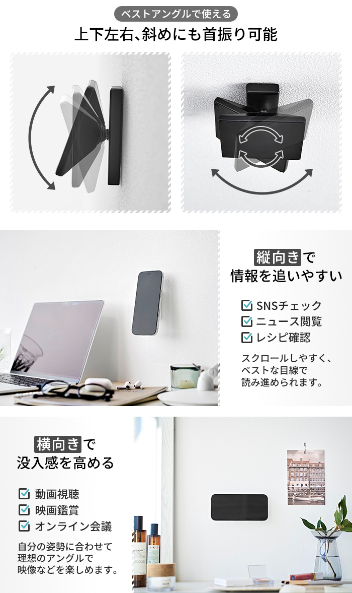 いつでも、見やすい角度で。上下左右・斜めまで自由に首振りができる壁付けスマホホルダー。