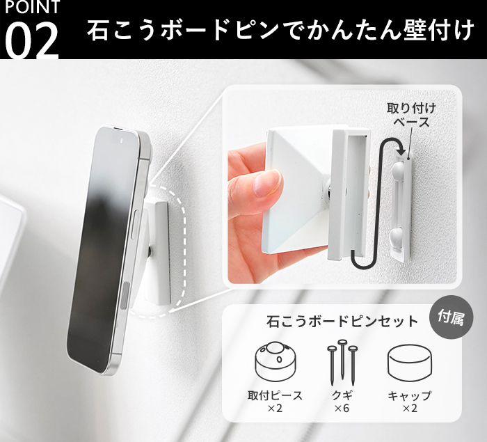 石こうボードピンで手軽に設置でき、マグネットでスマホをピタッと固定。