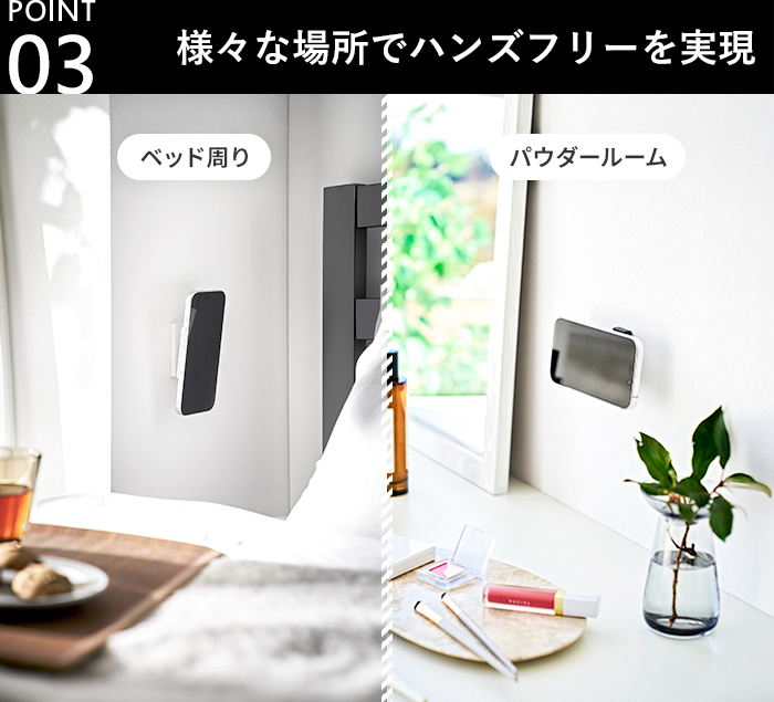 デスク周りはもちろん、ベッドサイドに設置すれば、スマホを手に持つ負担なく、横になったまま快適に映像や読書を楽しめます。パウダールームではメイクや身支度をしながら画面をチェックするなど、場所を選ばずマルチに活躍。