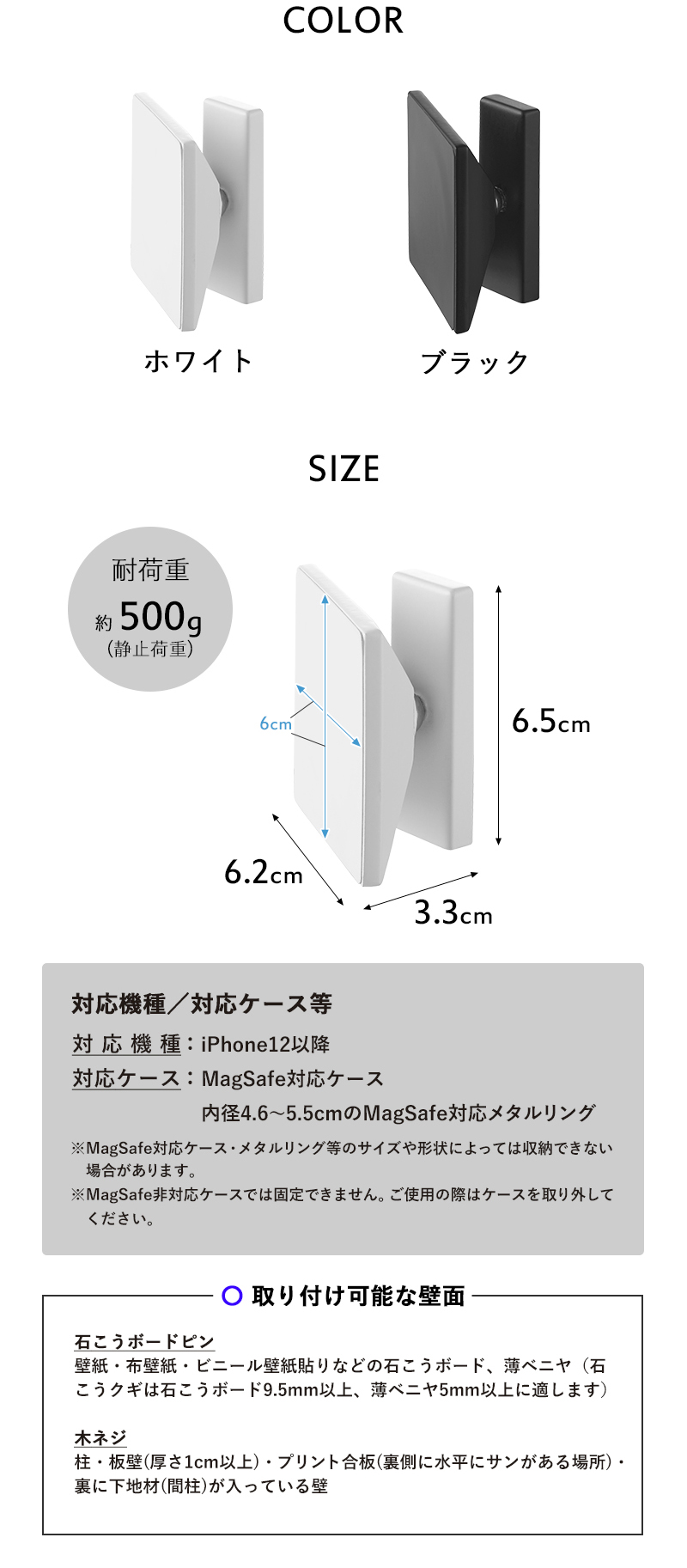 | 備 考 | <取り付け可能な壁> 石こうボードピン使用時:壁紙・布壁紙・ビニール壁紙貼りなどの石こうボード・薄ベニヤ(石こうクギは石こうボード9.5mm以上、薄ベニヤ5mm以上に適します) 木ネジ使用時:柱・板壁(厚さ1cm以上)・プリント合板(裏側に水平にサンがある場所)・裏に下地材(間柱)が入っている壁 <対応機種> iPhone12以降 <対応ケース> MagSafe対応ケース 内径4.6〜5.5cmのMagSafe対応メタルリング ※MagSafe対応ケース・メタルリング等のサイズや形状によっては収納できない場合があります。 ※MagSafe非対応ケースでは固定できません。ご使用の際はケースを取り外してください。 |