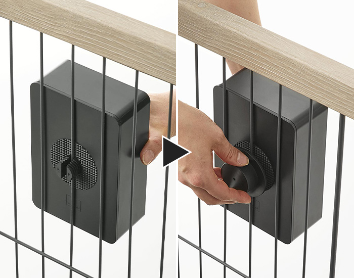 背面の取付ベースをケージの柵に挟み込み、後ろからキャップをくるっと締めるだけで設置完了。取付ベースとキャップはネジ式なのでしっかり固定でき、ズレる心配もありません。