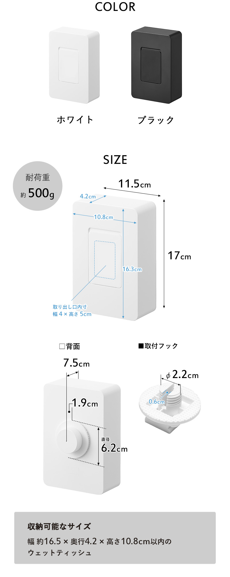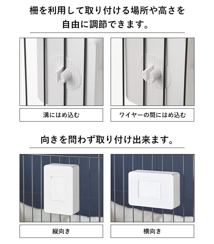 | 備 考 | <収納可能な対応サイズ> 約 幅16.3 × 奥行き4.2 × 高さ10.8cm以内のウェットティッシュ ※ペットケージのワイヤーのサイズや厚さ、形状、材質によっては取付できない場合があります。 |