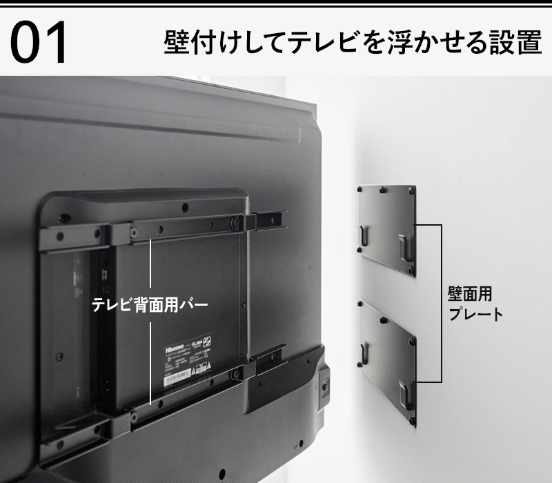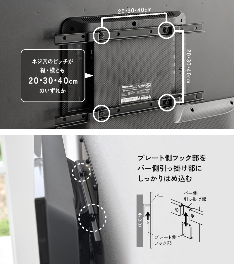 壁面にプレート2個を取り付け、テレビ背面のネジ穴に固定したバー2本をプレートのフック部に掛けるだけで簡単にテレビを壁付けできます。こちらの製品はVESA規格に対応した24〜55インチのテレビにご使用いただけます。