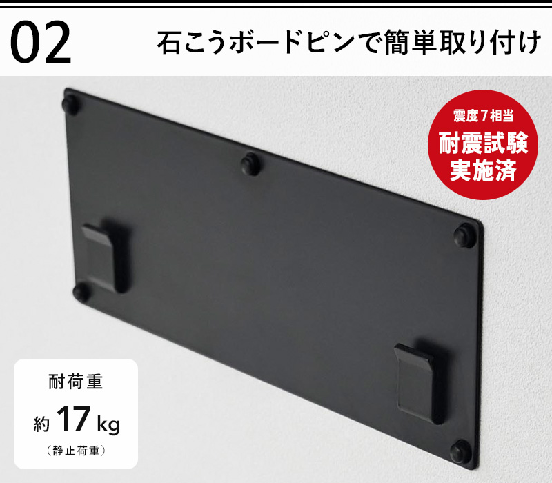 壁の穴が目立ちにくい石こうボードピンで簡単に取り付けできるため賃貸物件でも設置しやすく、震度7相当の耐震試験も実施済みなので安心してご使用いただけます。