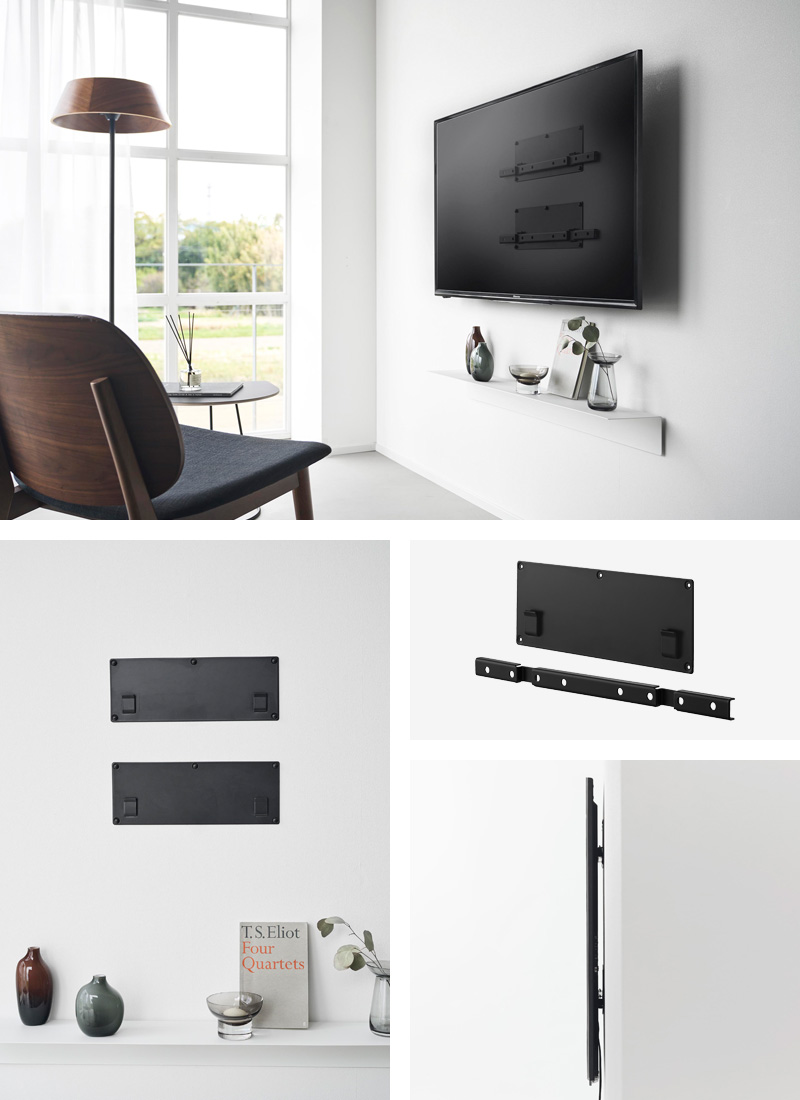 プレート2個を壁面に設置して、テレビの背面に取り付けたバーを掛けるだけでテレビを壁に固定できる壁付けホルダー。
