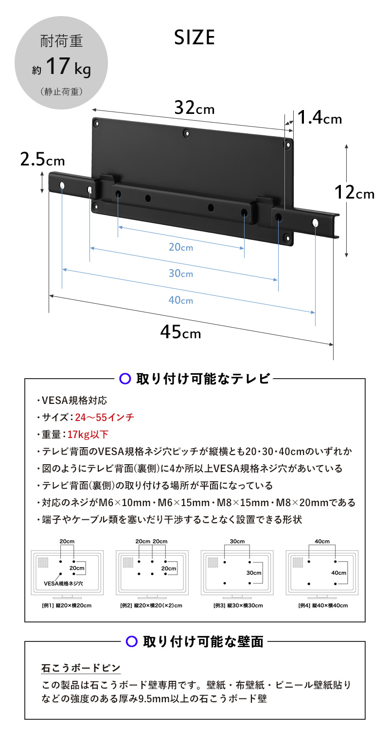 | 備 考 | <取り付け可能なテレビ(VESA規格対応)> サイズ:24〜55インチ 重量:17kg以下 VESA規格ネジ穴ピッチ:縦横 20・30・40cm 背面が平らなテレビ <取り付け可能な壁> 壁紙・布壁紙・ビニール壁紙貼りなどの強度のある厚み9.5mm以上の石こうボード壁 |
