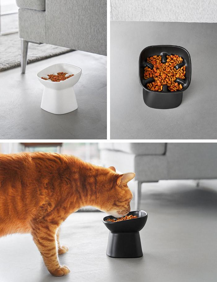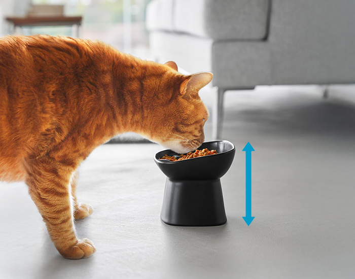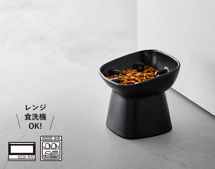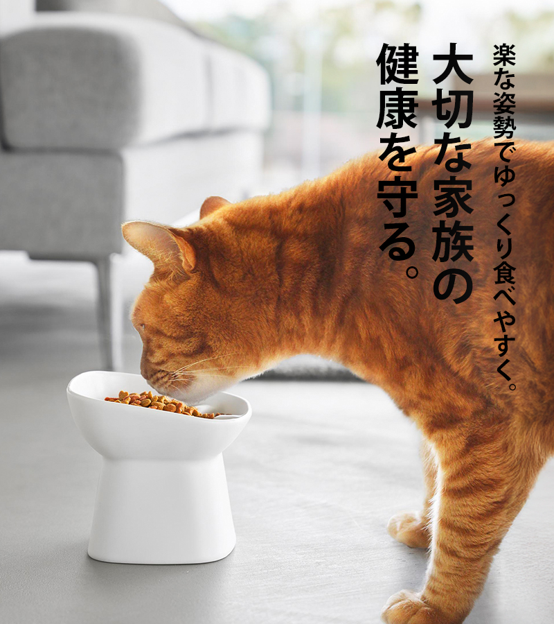 ボウルの中の凹凸で食べるスピードが抑えられ早食いを防止してくれます。 さらに、程よい高さと傾斜で首や足腰への負担を軽減。楽な姿勢で食事を楽しむことができます。