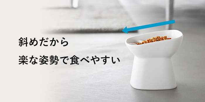 低い姿勢で食べていると体への負担が大きく、吐き戻しの原因にも。 食べやすい高さにすることで首や足腰の負担を軽減し、吐き戻しのリスクも抑えてくれます。さらに、ボウル部分が手前に向かって斜めになっているので、楽な姿勢で食事を楽むことができます。