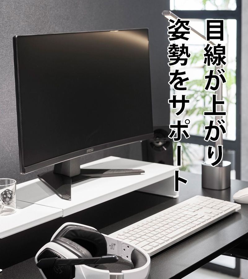 目線を自然の高さにあげながら、モニター下にはキーボードや小物をすっきり収納。作業スペースにゆとりを生み出します。