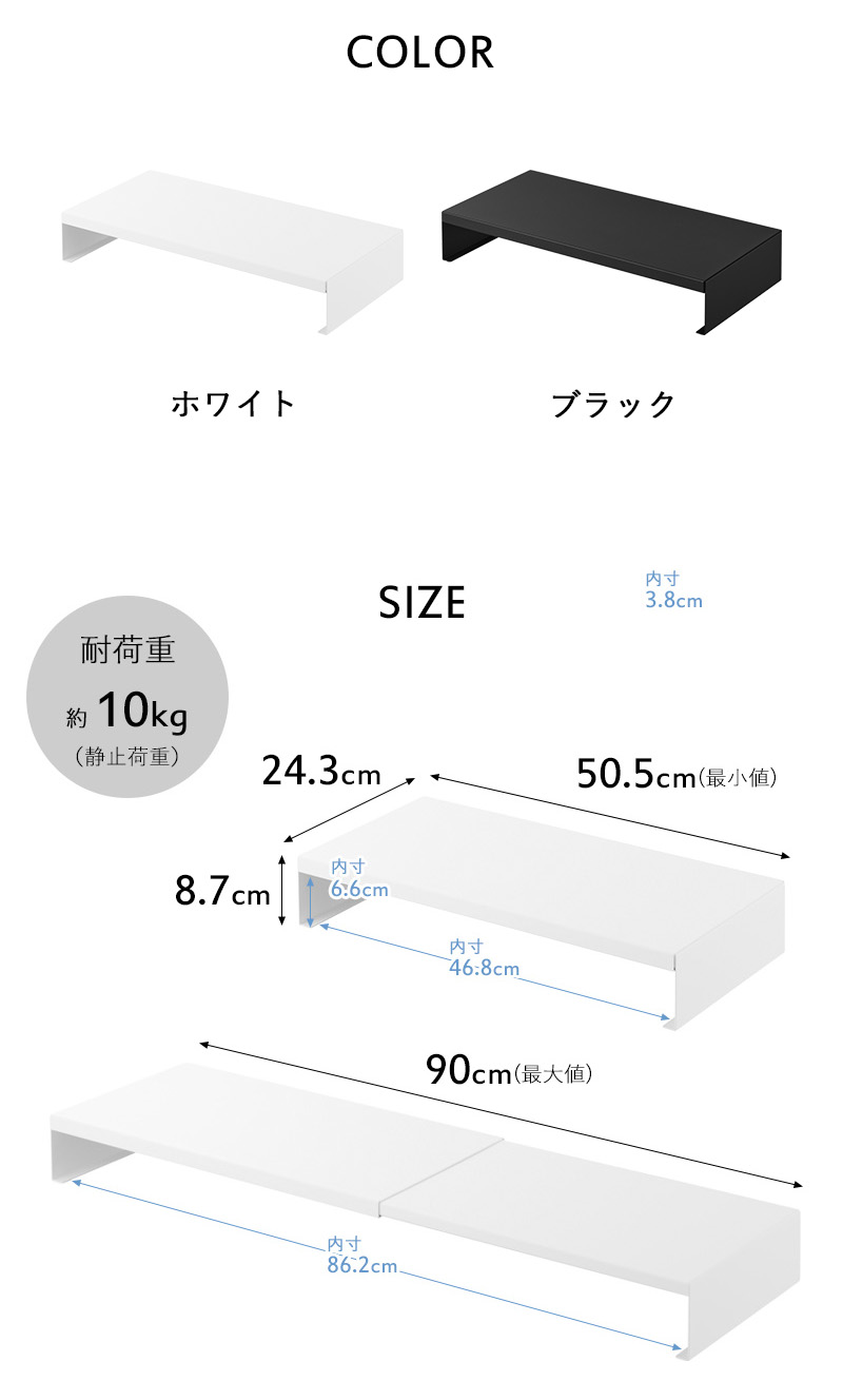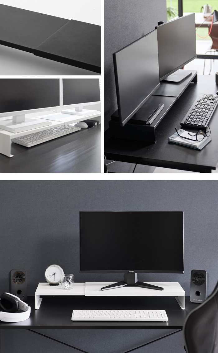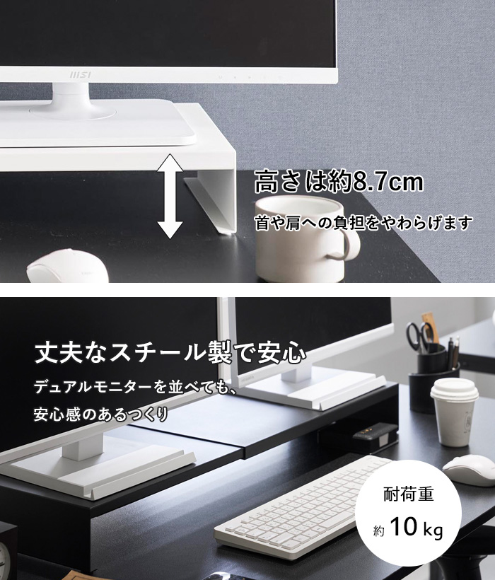 丈夫なスチール製で、耐荷重は約10kg。デュアルモニターを並べて置いたり、モニター+スピーカーなど周辺機器を置いたりと、横幅を活かし、しっかり支えます。