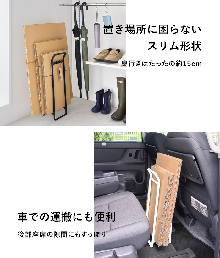 スリムな形状だから壁際やちょっとした隙間にも置きやすく、かさばりがちなダンボールを場所を取らずに保管できます。