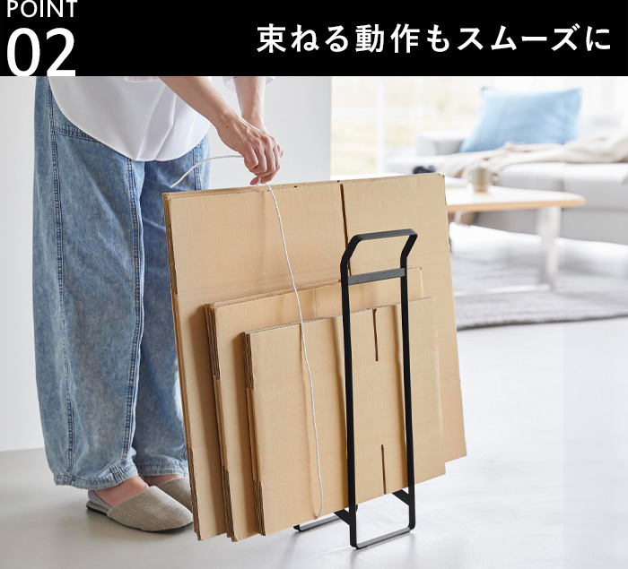 ストッカーにダンボールを立てたまま、束ねる作業もできる構造に。持ち上げたり押さえたりする必要がなく、その場でまとめられるので片付けの流れもスムーズです。
