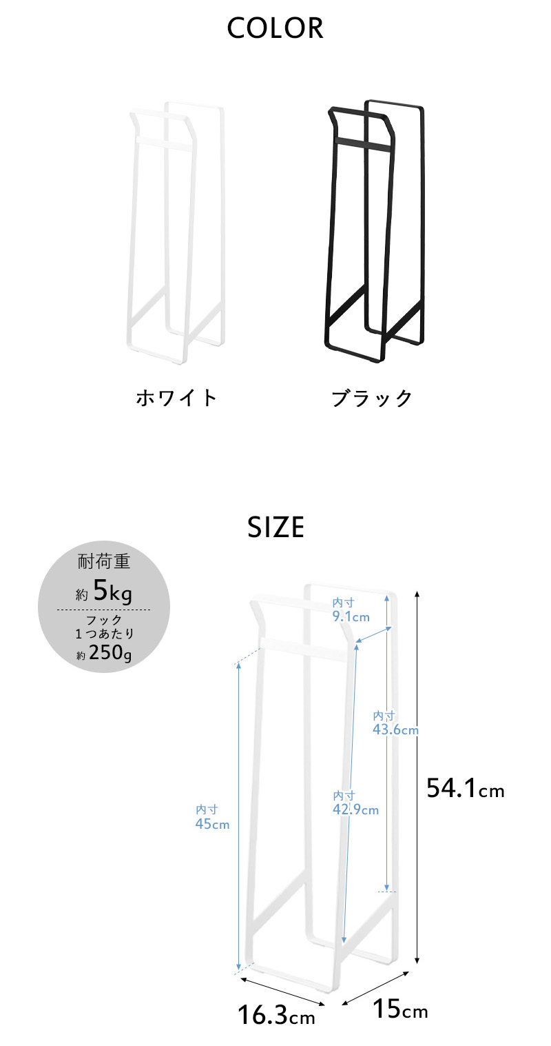 | サイズ | 約 幅16.3 × 奥行き15 × 高さ54.1cm (収納部内寸:約 奥行き9.1 × 高さ42.9〜43.6cm) |