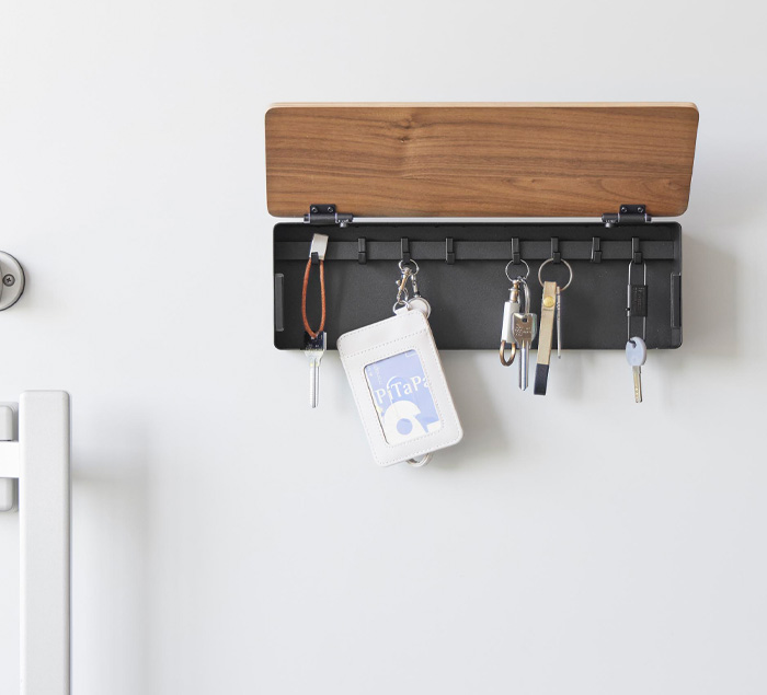 玄関まわりで置き場所に迷いがちな鍵を、すっきりまとめて収納できるキーフック。マグネットで取り付けられるので、スチール扉などに簡単に設置できます。