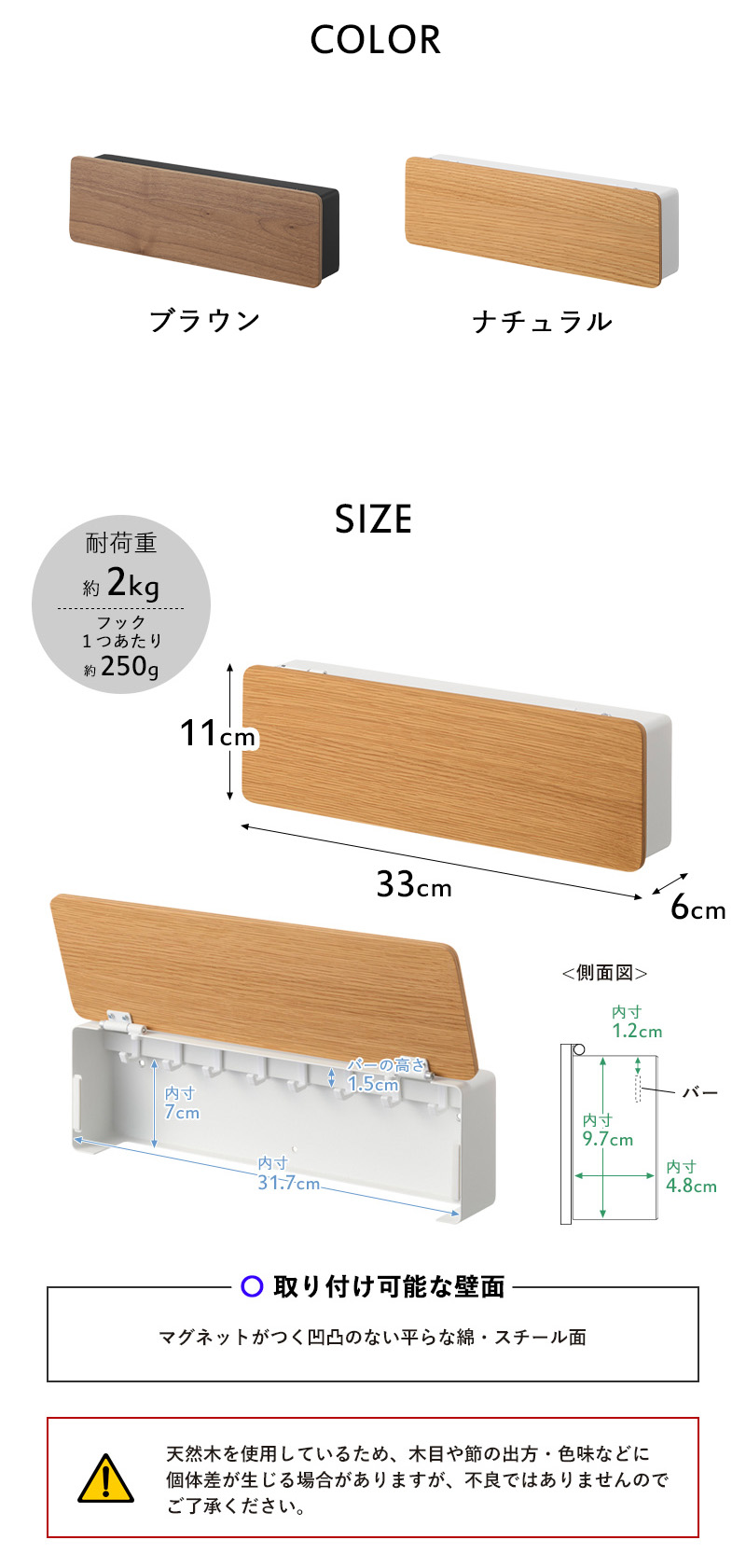 | 材 質 | 本体:スチール(粉体塗装)、マグネット 扉:天然木積層合板(ウレタン樹脂塗装) 滑り止め・緩衝材:シリコーンゴム フック:ポリカーボネート |
