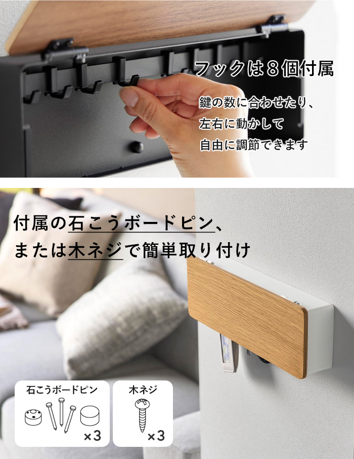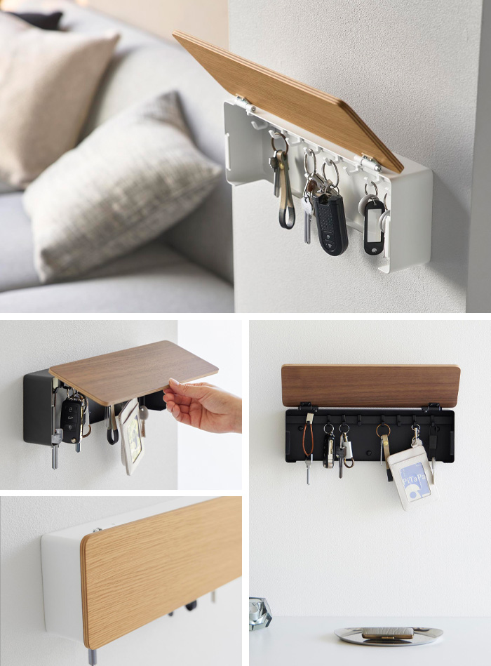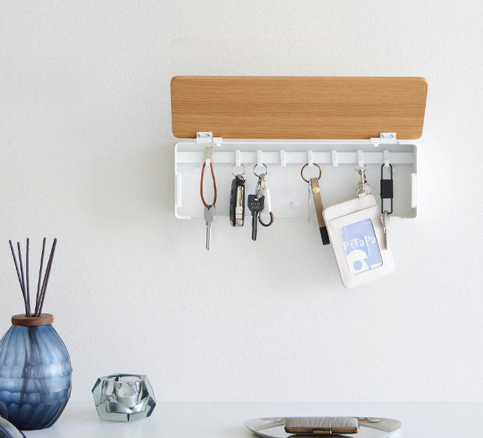 玄関のほか、帰宅後に立ち寄る廊下やリビングにも取り付けやすく、鍵の置き場所を暮らしに合わせて選べます。