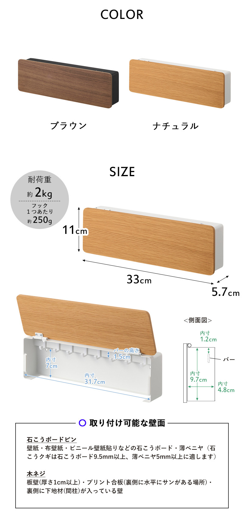 | 耐荷重 | 約 2kg(フック1つあたり:約 250g) (静止荷重) |
