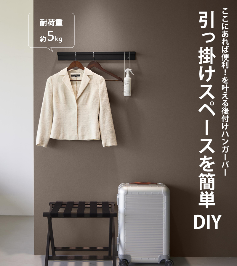 置き型のコートハンガーだとお部屋が狭くなりそう、そこまで大掛かりなものが必要ないなら、こちらのウォールタイプのハンガーバーはいかがでしょうか。