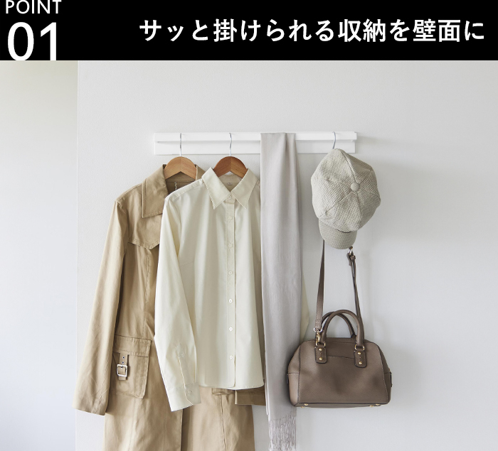 生活導線を意識した引っ掛け収納で、一時置きの散らかりを予防したり、日々の身支度を効率化したりすることができます。
